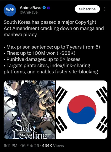 arrow-up1238arrow-down1imageSouth Korea has passed a major Copyright Act Amendment cracking down on manga and manhwa piracy.plus-squarelemmy.dbzer0.comthemachinestops@lemmy.dbzer0.com to Piracy: ꜱᴀɪʟ ᴛʜᴇ ʜɪɢʜ ꜱᴇᴀꜱ@lemmy.dbzer0.comEnglish · edit-213 hours agomessage-square33linkfedilink