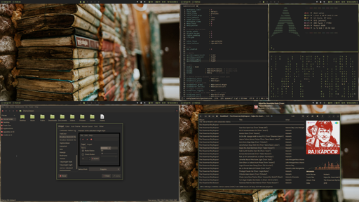 wm: spectrwm bar: polybar editor: pragtical terminal: alacritty file manager: pcmanfm music player: deadbeef compositor: picom
