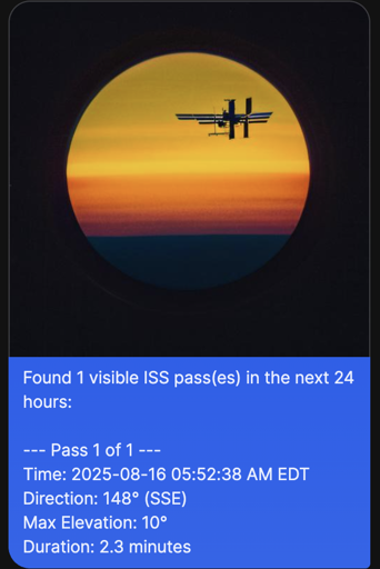To make things a bit more interesting I wanted to add a unique image to the summary message for days when there’s a flyover. I decided to use Gemini for the prompt generation, just because I have access to it and wanted to see how difficult it would be (not difficult at all). I gave Gemini very broad instructions, something like “It has to be about the ISS, be creative, it needs to be less than 75 tokens, and provide the prompt in JSON format”. I then send that prompt over to my locally hosted Automatic1111 instance and it returns an image. I pair that image with the summary message and send it out.