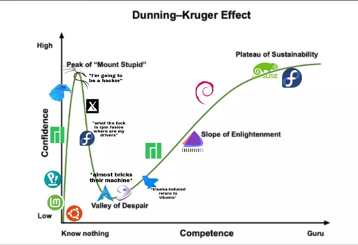 Alt text: A line plot with 2 axis (confidence vs competence) referencing the Dunning-Kruger effect with various distro logos placed at different points on the line. Starts with mint/ubuntu near (0,0) and progressing through multiple distros to end up with opensuse/fedora at what it calls “the plateau of sustainability”