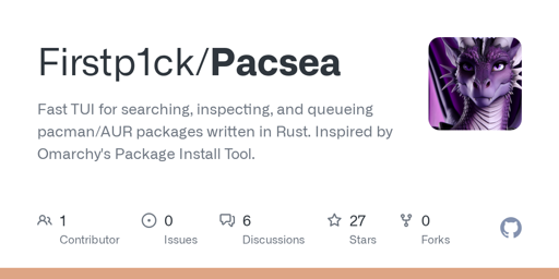 arrow-up118arrow-down1external-linkPacsea - Fast TUI for searching, inspecting, and queueing pacman/AUR packages written in Rustgithub.comcm0002@sh.itjust.works to Linux@programming.dev · 5 months agomessage-square1linkfedilink
