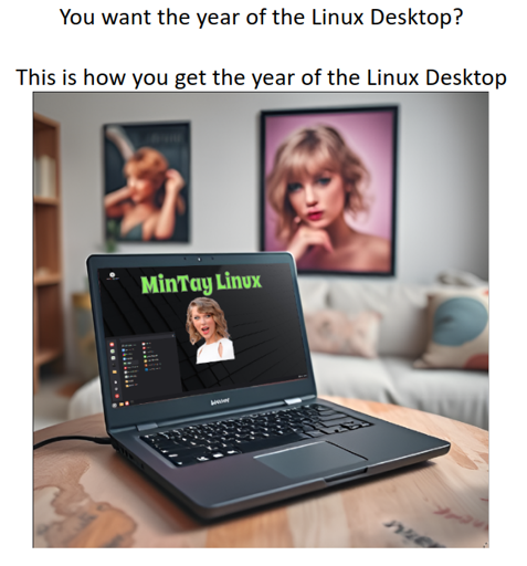 The superficiality is kind of the point I’m trying to make. Repackage Mint as “MinTay Linux” and that’s all it would take for the Swifties to pounce on something as “challenging” as switching from Windows to Linux. There, Peter explained the joke to you, are you happy?