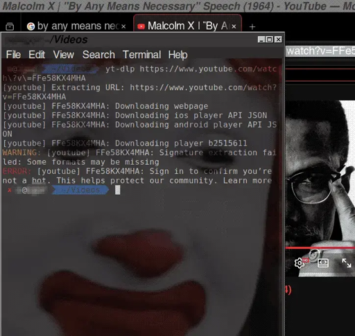 $ yt-dlp https://www.youtube.com/watch/?v%5C=FFe58KX4MHA [youtube] Extracting URL: https://www.youtube.com/watch?v=FFe58KX4MHA [youtube] FFe58KX4MHA: Downloading webpage [youtube] FFe58KX4MHA: Downloading tv client config [youtube] FFe58KX4MHA: Downloading player b2515611-main [youtube] FFe58KX4MHA: Downloading tv player API JSON [youtube] FFe58KX4MHA: Downloading ios player API JSON WARNING: [youtube] FFe58KX4MHA: Signature extraction failed: Some formats may be missing WARNING: [youtube] FFe58KX4MHA: Some web client https formats have been skipped as they are missing a url. YouTube is forcing SABR streaming for this client. See https://github.com/yt-dlp/yt-dlp/issues/12482 for more details [youtube] FFe58KX4MHA: Downloading m3u8 information [info] FFe58KX4MHA: Downloading 1 format(s): 614+234 [hlsnative] Downloading m3u8 manifest [hlsnative] Total fragments: 86 [download] Destination: Malcolm X | "By Any Means Necessary" Speech (1964) [FFe58KX4MHA].f614.mp4 [download] 100% of 22.74MiB in 00:00:16 at 1.41MiB/s [hlsnative] Downloading m3u8 manifest [hlsnative] Total fragments: 86 [download] Destination: Malcolm X | "By Any Means Necessary" Speech (1964) [FFe58KX4MHA].f234.mp4 [download] 100% of 7.14MiB in 00:00:08 at 902.54KiB/s [Merger] Merging formats into "Malcolm X | "By Any Means Necessary" Speech (1964) [FFe58KX4MHA].mp4" Deleting original file Malcolm X | "By Any Means Necessary" Speech (1964) [FFe58KX4MHA].f234.mp4 (pass -k to keep) Deleting original file Malcolm X | "By Any Means Necessary" Speech (1964) [FFe58KX4MHA].f614.mp4 (pass -k to keep) $EDIT : for those keeping score, IDK what to do at this point. If you like helping, give a hand.