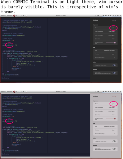 When COSMIC Terminal is on Light theme, vim’s cursor is barely visible.