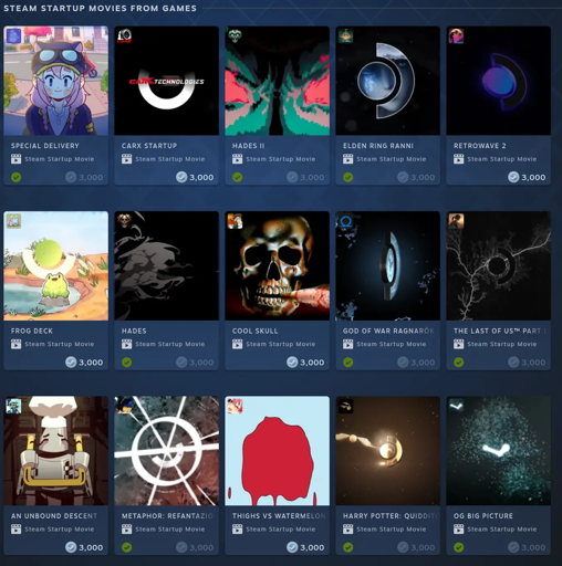 Direct link to said startup movies: https://store.steampowered.com/points/shop/c/startupmovie