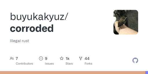 noumenon@lemmy.world to Rust@programming.devEnglish · 9 days agocorroded: Illegal rustgithub.comexternal-linkmessage-square7linkfedilinkarrow-up167arrow-down14file-text