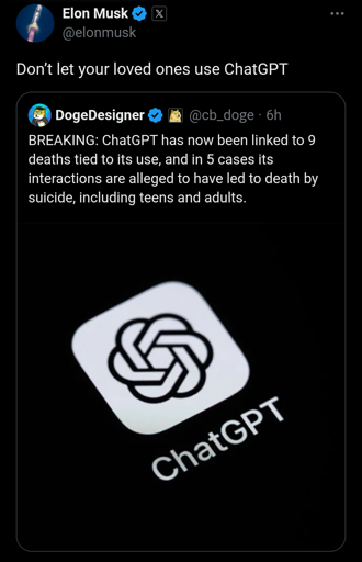 arrow-up1125arrow-down1imageElon Musk and Sam Altman clashed on X after Musk shared a post about a man who committed a murder-suicide following delusional conversations with ChatGPTlemmus.orgBeep@lemmus.org to Technology@beehaw.orgEnglish · 13 days agomessage-square21linkfedilinkfile-text