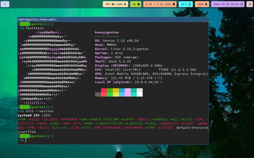 It took about 23 hours to get it booted under its own power using a binary kernel. And on the 4th day (today) I’ve managed to get a custom kernel working. Gentoo has been very fun to use and to customize, and it’s very fast and responsive, even on my old hardware and with a hard disk, browsing heavy webpages with Librewolf is no problem at all. I’ve been sleeping on Gentoo for WAY to long.